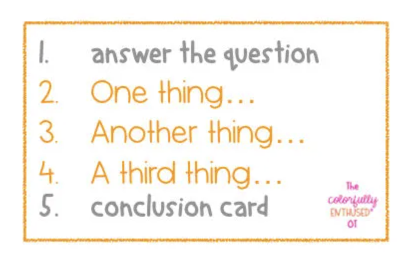 As outlined, we work together to choose the specific “Sentence Starter” card that makes the most sense for what the student wants to talk about. With practice and fading prompts, the student becomes more and more independent in using the cards—eventually, many students become independent in choosing the “Sentence Starter Card” that is most appropriate for what they’re writing about. The “Sentence Starter Card” provides them with clear phrasing to initiate each sentence of the paragraph, with cues like “First,” “Next,” and “Finally.” If the cue card is laminated for the student, they can use a dry erase marker to cross off each sentence’s cue as it is written. This increases the student’s level of independence by keeping them on track without needing verbal prompting or visual cuing from an adult!
