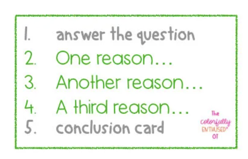1. The “Sentence Starter Cards” – These four cards provide an organized, five-step outline for writing different types of paragraphs. For the first step, I typically provide the student with a topic sentence or ask them a question. The student’s answer to the question then becomes the topic sentence.